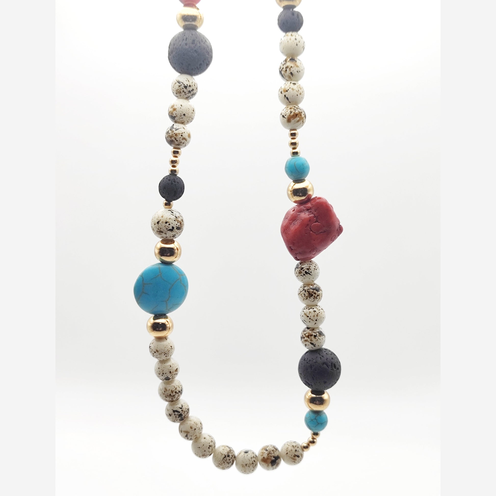 Showcase your unique style with this striking handmade necklace, featuring genuine natural stones and luxurious details. White volcanic lava beads with their distinctive porous texture gracefully embrace the neckline, while larger black lava stones create a bold contrast. The vivid red coral centerpiece adds a touch of vibrant color and character, beautifully complemented by turquoise stones reminiscent of Aegean blue.