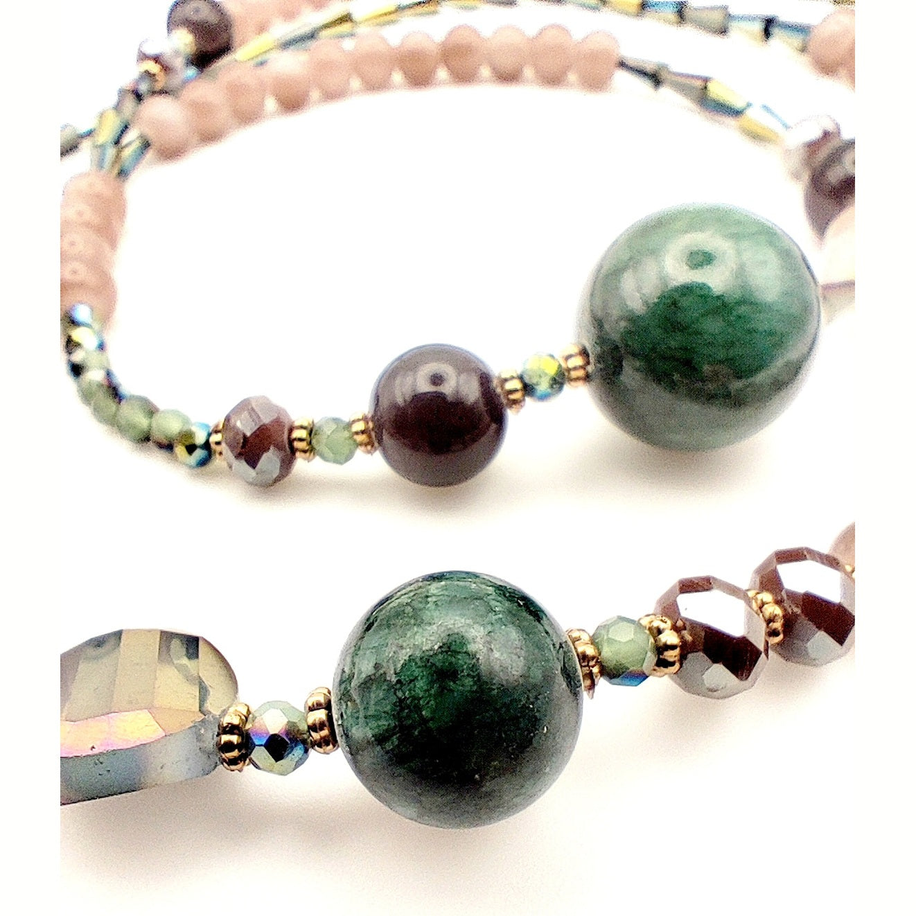 Add an elegant touch of natural beauty to your look with this handmade necklace combining carefully selected semi-precious stones and premium materials. Smooth Green Agate beads symbolize renewal and harmony, soft Rose Quartz infuses a sense of gentle femininity, and deep Black Obsidian offers grounding energy and protection.